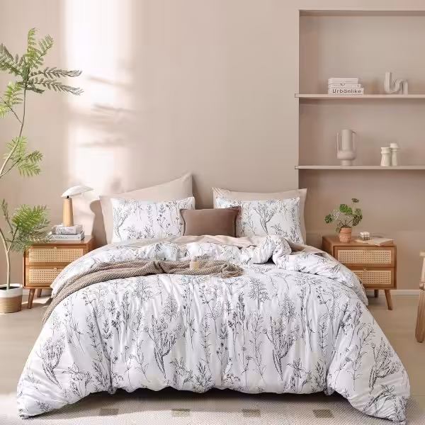 The delicate white botanical print brings a calm, nature-inspired touch to your bedroom, blending timeless style with understated charm.